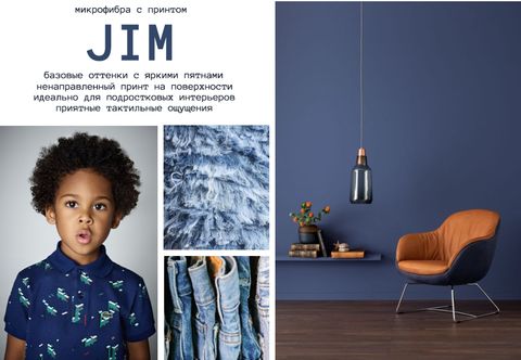 Jim — коллекция со вкусом Мальчишки такие мальчишки, синие джинсы, яркие футболки, веселые улыбки. Они говорят, что любят темный металл и бетонные стены, но при этом не отказываются от мягких пледов и горячего шоколада. Наша коллекция принтованной микрофибры Jim с таким же характером. В ее цветовой гамме найдутся как консервативные цвета в сливочно бежевой, коричневой и серой гамме - от стального до угольного, так и яркие оттенки денима, куркумы и мандарина. Тактильно коллекция Jim по-настоящему удивляет своей бархатистой фактурой. При этом материал не имеет блеска и подходит для любых форм мебели и абсолютно разных интерьеров, в том числе и для подростковых. Большой плюс — это ненаправленный рисунок коллекции, который позволяет оптимизировать расход материала при раскрое. Оптимальное соотношение цены и качества добавляет коллекции еще один плюс. Jim — коллекция с характером.